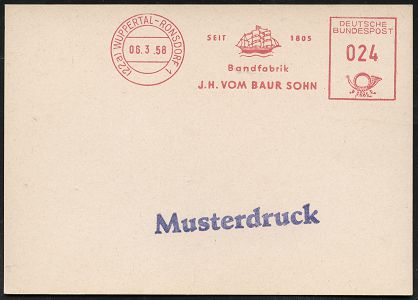10292 | 20 € | 5600 WUPPERTAL (Absender-Freistempel) : (22a) WUPPERTAL-RONSDORF 1/ SEIT 1805/ Bandfabrik/ J.H.VOM BAUR SOHN 1958 (6.3.) AFS Francotyp "Posthorn", Francotyp-Archiv-Muster (3-Mast-Bark) + blauer 1L: Musterdruck, glasklar gest., seltene Archiv-Musterkarte, sehr kleine Auflage! (Dü.E-23CO) | ![]() | |