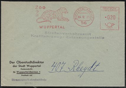 10297 | 14 € | 5600 WUPPERTAL (Absender-Freistempel) : 56 WUPPERTAL-BARMEN 1/ ZOO/ ZOO 1963 (4.12.) AFS Francotyp (= Leopard) klar auf Kommunalbf.: Der Oberstadtdirektor.. + 1L: Strassenverkehrsbehörde (Dü.E-26) | ![]() | |