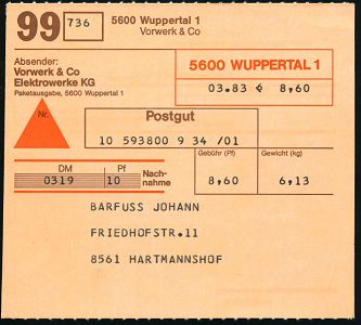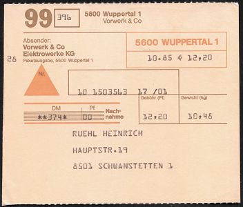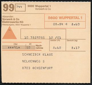 10305 | 11 € | 5600 WUPPERTAL (Absender-Freistempel) : 5600 WUPPERTAL 1 1985 EDV-Paket-Freistempel 12,20 (DM) der Fa. Vorwerk ohne Tagesdatum mit e c k i g e n Ziffern = 7.Gew.Stufe, Inl.-Selbstbucher-NN-Paketkt.: Vorwerk & Co, Elektrowerke KG | ![]() | |