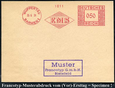 10189 | 35 € | 5600 WUPPERTAL (Absender-Freistempel) : WUPPERTAL-/ BARMEN 1/ E M S 1931 (25.6.) AFS-Musterabdruck Francotyp "Mäanderrechteck" (Monogr.-Logo) glasklar gest. Francotyp-Musterblatt vom (Vor)-Ersttag !, selten! (Dü.E-2CEh) | ![]() ![]() | |