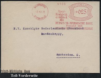 10194 | 15 € | 5600 WUPPERTAL (Absender-Freistempel) : WUPPERTAL-/ ELBERFELD/ Spar-/ Konten/ eröffnet/ die/ BERGISCH-MÄRKISCHE BANK.. 1931 (3.10.) AFS Francotyp "Bogenrechteck" 025 Pf. auf Ausl.-Teil-Vorderseite ( = Deutsche Bank !) n. Amsterdam (Dü.E-1Ah) | ![]() ![]() | |