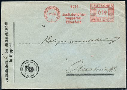 10195 | 20 € | 5600 WUPPERTAL (Absender-Freistempel) : WUPPERTAL-ELBERFELD/ 1/ Justizbehörden/ Wuppertal-/ Elberfeld 1932 (2.4.) AFS Francotyp "Mäanderrechteck" auf Dienst-Bf. mit preuss. Adler (Dü.E-2BAh) | ![]() | |