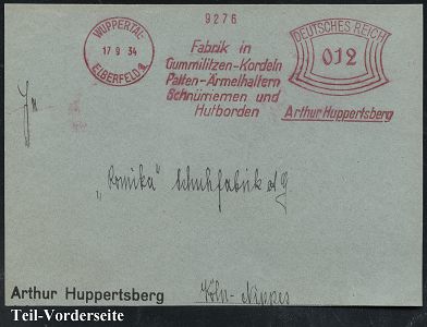 10201 | 16 € | 5600 WUPPERTAL (Absender-Freistempel) : WUPPERTAL-/ ELBERFELD 1/ Fabrik in/ Gummilitzen-Kordeln/ Patten-Ärmelhaltern/ Schnürriemen u./ Hutborden/ Arthur Huppertsberg 1934 (17.9.) AFS Francotyp "Bogenrechteck" , klar gest. Teil-Vorderseite, = seltene Thematik! (Dü.E-1CEh) | ![]() | |