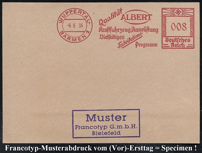 10205 | 35 € | 5600 WUPPERTAL (Absender-Freistempel) : WUPPERTAL-/ BARMEN 1/ ...ALBERT/ Kraftfahrzeug-Ausrüstung.. 1935 (6.5.) AFS Francotyp-Musterabdruck "Hakenkreuz" , glasklar gest. Francotyp-Musterblatt vom (Vor)-Ersttag !, selten! (Dü.E-3CEo) | ![]() ![]() | |