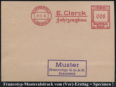 10206 | 35 € | 5600 WUPPERTAL (Absender-Freistempel) : WUPPERTAL-/ ELBERFELD/ E.Clerck/ Fahrzeugbau 1935 (21.5.) AFS-Musterabdruck Francotyp "Hakrenkreuz" , glasklar gest. Francotyp-Musterblatt vom (Vor)-Ersttag !, selten! (Dü.E-3CEo) | ![]() ![]() | |