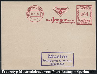 10209 | 35 € | 5600 WUPPERTAL (Absender-Freistempel) : WUPPERTAL-ELBERFELD/ Jaeger/ G.u.J.Jaeger GmbH.. 1936 (31.1.) AFS-Musterabdruck Francotyp "Hakenkreuz" (Firmenlogo) glasklar gest. Francotyp-Musterblatt vom (Vor)-Ersttag !, selten! (Dü.E-3CEo) | ![]() ![]() | |