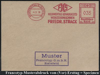 10210 | 35 € | 5600 WUPPERTAL (Absender-Freistempel) : WUPPERTAL-ELBERFELD/ F S/ HOCHWERTIGE GENAUIGKEITS-/ WERKZEUGMASCHINEN/ FRIEDR.STRACK 1936 (4.3.) AFS-Musterabdruck Francotyp "Hakenkreuz" (Monogr.-Logo mit Zahnrädern) glasklar gest. Francotyp-Musterblatt vom (Vor)-Ersttag !, selten! (Dü.E-3CEo) | ![]() ![]() | |