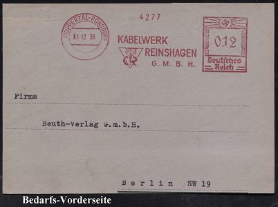 10213 | 14 € | 5600 WUPPERTAL (Absender-Freistempel) : WUPPERTAL-RONSDORF/ KABELWERK/ RHEINSHAGEN.. 1938 (1.12.) AFS Francotyp "Hakenkreuz" (Monogr.-Logo) klar gest. Teil-Vorderseite (Dü.E-3CEh) | ![]() | |
