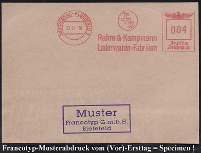 10214 | 35 € | 5600 WUPPERTAL (Absender-Freistempel) : WUPPERTAL-ELBERFELD 1/ r k/ Rahm & Kampmann/ Lederwaren-Fabriken 1936 (23.12.) AFS-Musterabdruck Francotyp "Reichsadler" (Monogr.-Logo) glasklar gest. Francotyp-Musterblatt vom (Vor)-Ersttag !, selten! (Dü.E-5CGo) | ![]() ![]() | |