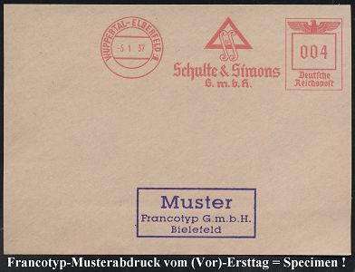10216 | 35 € | 5600 WUPPERTAL (Absender-Freistempel) : WUPPERTAL-ELBERFELD 1/ S u S/ Schulte & Simons/ GmbH 1937 (5.1.) AFS-Musterabdruck "Reichsadler" (Monogr.-Logo mit Dreieck) glasklar gest. Francotyp-Musterblatt vom (Vor)-Ersttag !, selten! (Dü.E.5CGo) | ![]() ![]() | |
