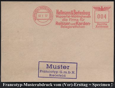 10217 | 35 € | 5600 WUPPERTAL (Absender-Freistempel) : WUPPERTAL-WICHLINGHAUSEN/ Hellmann & Bertenburg/ ..die Firma für/ Reisser. u. Karden-/ Belagbrettchen 1937 (13.1.) AFS-Musterabdruck Francotyp "Reichsadler" , glasklar gest. Francotyp-Musterblatt vom (Vor)-Ersttag !, selten! (Dü.E-5CGo) | ![]() ![]() | |