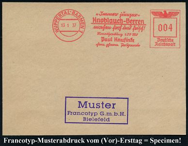10218 | 35 € | 5600 WUPPERTAL (Absender-Freistempel) : WUPPERTAL-BARMEN 1/ "Jmmer jünger"/ Knoblauch-Beeren/ machen froh u.frisch!/ ..Paul Knufinke.. 1937 (13.1.) AFS-Musterabdruck Francotyp "Reichsadler" , Text teils in Sütterlin, glasklar gest. Francotyp-Musterblatt vom (Vor)-Ersttag!, selten! (Dü.E-5CGo) | ![]() ![]() | |