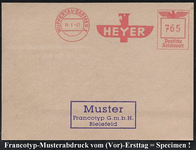 10219 | 35 € | 5600 WUPPERTAL (Absender-Freistempel) : WUPPERTAL-BARMEN 1/ HEYER 1937 (14.1.) AFS-Musterabdruck Francotyp "Reichsadler" (Adler-Firmenlogo) glasklar gest. Francotyp-Musterblatt vom (Vor)-Ersttag !, selten! (Dü.E-5CGo) | ![]() ![]() | |