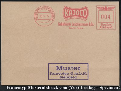 10224 | 35 € | 5600 WUPPERTAL (Absender-Freistempel) : WUPPERTAL-NÄCHSTEBRECK/ KAJOCO/ GES.GESCH.WARENZEICHEN/ Kabelfabrik Joachimsmeyer & Co.. 1937 (10.5.) AFS-Musterabdruck Francotyp "Reichsadler" (Firmenlogo) glasklar gest. Francotyp-Musterblatt vom (Vor)-Ersttag !, selten! (Dü.E-5CGo) | ![]() ![]() | |