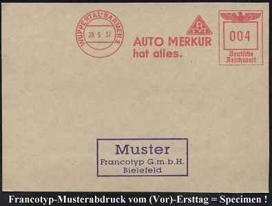10226 | 35 € | 5600 WUPPERTAL (Absender-Freistempel) : WUPPERTAL-BARMEN 1/ AUTO MERKUR/ hat alles. 1937 (28.5.) AFS-Musterabdruck Francotyp "Reichsadler" (Monogr.-Logo) glasklar gest. Francotyp-Musterblatt vom (Vor)-Ersttag !, selten! (Dü.E-5CGo) | ![]() ![]() | |
