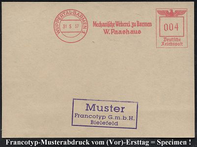 10227 | 35 € | 5600 WUPPERTAL (Absender-Freistempel) : WUPPERTAL-BARMEN 1/ Mechanische Weberei zu Barmen/ W.Paashaus 1937 (31.5.) AFS-Musterabdruck Francotyp "Reichsadler" , glasklar gest. Francotyp-Musterblatt vom (Vor)-Ersttag !, selten! (Dü.E-5CGo) | ![]() ![]() | |