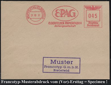 10229 | 35 € | 5600 WUPPERTAL (Absender-Freistempel) : WUPPERTAL-ELBERFELD/ EPAG/ ELBERFELDER PAPIERFABRIK/ AG 1937 (21.10.) AFS-Musterabdruck Francotyp "Reichsadler" (Monogr.-Logo) glasklargest. Francotyp-Musterblatt vom (Vor)-Ersttag !, selten! (Dü.E-5CGo) | ![]() ![]() | |