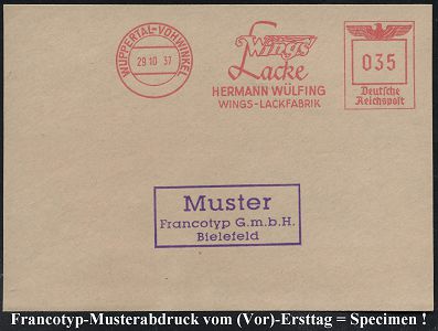 10230 | 35 € | 5600 WUPPERTAL (Absender-Freistempel) : WUPPERTAL-VOHWINKEL/ Wings´/ Lacke/ HERMANN WÜLFING/ WINGS-LACKFABRIK 1937 (29.10.) AFS-Musterabdruck Francotyp "Reichsadler" (Firmenlogo: Flügel) glasklar gest. Francotyp-Musterblatrt vom (Vor9-Ersttag !, selten! (Dü.E-5CGo) | ![]() ![]() | |