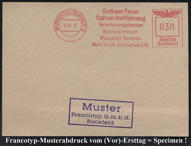 10231 | 35 € | 5600 WUPPERTAL (Absender-Freistempel) : WUPPERTAL-BARMEN 1/ Gothaer Feuer/ Gothaer Kraftfahrzeug/ Versicherungsbanken/ Bezirksdirektion.. 1937 (6.12.) AFS-Musterabdruck Francotyp "Reichsadler" , glasklar gest. Francotyp-Musterblatt vom (Vor)-Ersttag !, selten! (Dü.E-5CGo) | ![]() ![]() | |
