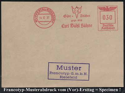 10232 | 35 € | 5600 WUPPERTAL (Absender-Freistempel) : WUPPERTAL-RONSDORF/ C.D./ Güte-Zeichen/ gegr.1859/ Carl Döhl Söhne 1937 (14.12.) AFS-Musterabdruck Francotyp "Reichsadler" (Monogr.-Logo = Werkzeugfabrik) glasklar gest. Francotyp-Musterblatt vom (Vor)-Ersttag !, selten!, vergl. Kat.-Nr. 10247, 10258 u. 10263 (Dü.E-5CGo) | ![]() ![]() | |