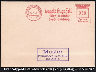 10236 | 35 € | 5600 WUPPERTAL (Absender-Freistempel) : WUPPERTAL-OBERBARMEN 1/ Leopold Hugo Zell/ Eisen- u. Stahl./ Großhandlung 1938 (25.2.) AFS-Musterabdruck Francotyp "Reichsadler" , glasklar gest. Francotyp-Musterblatt vom (Vor)-Ersttag !, selten! (Dü.E-5CGo) | ![]() ![]() | |
