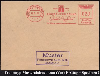 10239 | 35 € | 5600 WUPPERTAL (Absender-Freistempel) : WUPPERTAL-BARMEN 1/ ..AUGUST JUNG SÖHNE/ Graphische Kunstanstalt/ Wir drucken.. 1938 (19.8.) AFS-Musterabdruck Francotyp "Reichsadler" (Monogr.-Logo) glasklar gest. Francotyp-Musterblatt vom (Vor)-Ersttag !, selten! (Dü.E-5CGo) | ![]() ![]() | |