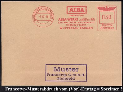 10241 | 35 € | 5600 WUPPERTAL (Absender-Freistempel) : WUPPERTAL-BARMEN 1/ ALBA/ WARENZEICHEN/ ALBA-WERKE/ ADOLF/ LÜBBERTSMEIER AG/ KATLWALZWERK MASCHINEN. U./ WERKZEUG-FABRIK.. 1938 (5.10.) AF-Musterabdruck Francotyp "Reichsadler" (Firmenlogo) glasklar gest. Francotyp-Musterblatt vom (Vor)-Ersttag !, selten! (Dü.E-5CGo) | ![]() ![]() | |
