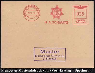 10242 | 35 € | 5600 WUPPERTAL (Absender-Freistempel) : WUPPERTAL-BARMEN 1/ EXCELSIOR/ TRADE MARK/ H.A.SCHMITZ 1938 (21.10.) AFS-Musterabdruck Francotyp "Reichsadler" (Firmenlogo: Stern) glasklar gest. Francotyp-Musterblatt vom (Vor)-Ersttag !, selten! (Dü.E-5CGo) | ![]() ![]() | |