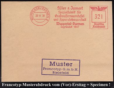 10244 | 35 € | 5600 WUPPERTAL (Absender-Freistempel) : WUPPERTAL-BARMEN 1/ Siller & Jamart/ Spezialfabrik für/ Großwasserraumkessel/ u. Apparatebauanstalt.. 1938 (20.11.) AFS-Musterabdruck Francotyp "Reichsadler" , glasklar gest. Francotyp-Musterblatt vom (Vor)-Ersttag !, selten! (Dü.E-5CGo) | ![]() ![]() | |