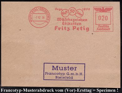 10245 | 35 € | 5600 WUPPERTAL (Absender-Freistempel) : WUPPERTAL-OBERBARMEN 1/ Gegr. 1890/ Fast 50 Jahre/ Wäschezeichen/ Etiketten/ Fritz Petig 1938 (7.12.) AFS-Musterabdruck Francotyp "Reichsadler" , glasklar gest. Francotyp-Musterblatt vom (Vor)-Ersttag !, selten! (Dü.E-5CGo) | ![]() ![]() | |