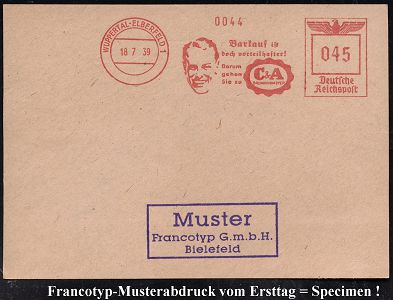 10249 | 35 € | 5600 WUPPERTAL (Absender-Freistempel) : WUPPERTAL-ELBERFELD 1/ Barkauf../ C & A/ BRENNINKMEYER 1939 (18.7.) AFS-Musterabdruck "Reichsadler" 045 Pf. (lachender Männerkopf) glasklar gest. Francotyp-Musterblatt vom Ersttag !, selten!, vergl. Kat.-Nr. 10248 (Dü.E-5CGh) | ![]() ![]() | |