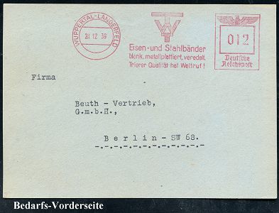 10253 | 15 € | 5600 WUPPERTAL (Absender-Freistempel) : WUPPERTAL-LANGERFELD/ Eisen-u.Stahlbänder/ blank,metallplattiert,veredelt/ Trierer Qualität.. 1939 (21.12.) AFS Francotyp "Reichsadler" (Monogr.-Logo) Bedarfs-Vorderseite (Dü.E-5CGo) | ![]() | |