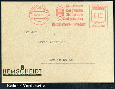 10255 | 15 € | 5600 WUPPERTAL (Absender-Freistempel) : WUPPERTAL-ELBERFELD 1/ Fabrikate für/ Bergwerke/ Steinbrüche/ Sondermaschinen/ Maschinenfabrik Hemscheidt 1939 (23.10.) AFS Francotyo "Reichsadler" (Monogr.-Logo) motivgl. Firen-Vorderseite (Dü.E-5CGo) | ![]() | |