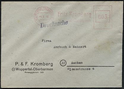 10259 | 25 € | 5600 WUPPERTAL (Absender-Freistempel) : WUPPERTAL-OBERBARMEN 1/ Fritz Kromberg.. 1946 (4.1.) aptierter AFS Francotyp "Reichsadler" = entfernt = Notmaßnahme! , Firmen-Fern-Bf. n. Aachen (Dü.E-13 AK-129o) | ![]() | |
