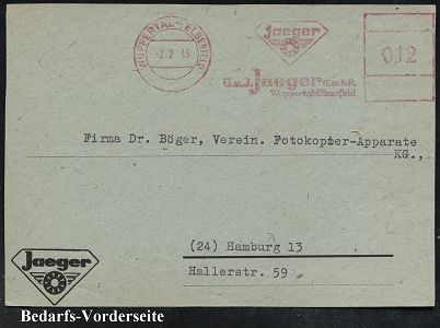 10260 | 20 € | 5600 WUPPERTAL (Absender-Freistempel) : WUPPERTAL-ELBERFELD/ Jeager/ G.u.J.Jeager GmbH.. 1946 (2.2.) seltener aptierter AFS Francotyp "Hakenkreuz" = entfernt = Notmaßnahme! (Firmenlogo) motivgl. Firmen-Vorderseite (Dü.E-12 AK-98o = seltene Type) | ![]() | |