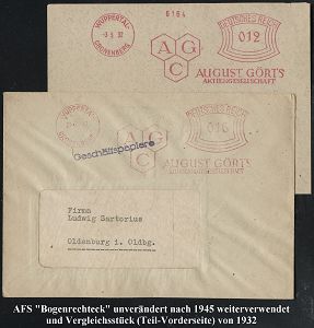 10271 | 30 € | 5600 WUPPERTAL (Absender-Freistempel) : WUPPERTAL-/ CRONENBERG/ A G C/ AUGUST GÖRTS/ AG 1947 (29.7.) AFS Francotyp "Bogenrechteck" u n v e r ä n d e r t weiterverwendet mit Inschrift "DEUTSCHES REICH" = Notmaßnahme ! (Monogr.-Logo) Firmen-Bf. "Geschäftspapiere" + AFS von 1932 zum Vergleich auf Teil-Vorderseite, 2 Belege (Dü.E-1CEo bzw. mit Zählnr. von 1932) | ![]() | |