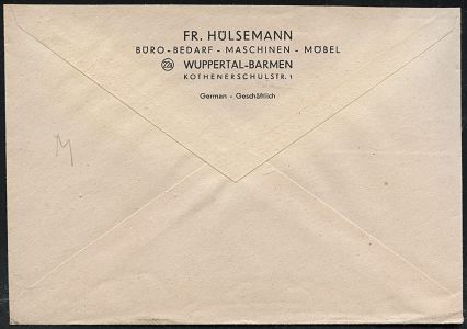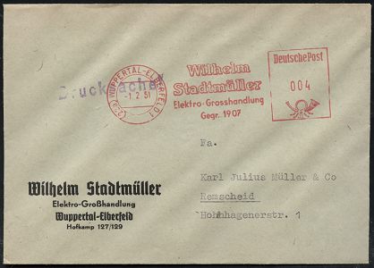 10280 | 15 € | 5600 WUPPERTAL (Absender-Freistempel) : (22a) WUPPERTAL-ELBERFELD 1/ Wilhelm/ Stadtmüller/ Elektro-Grosshandlung.. 1951 (1.2.) AFS Postalia "Posthorn Deutsche Post" , Firmen-Fern-Bf. + Postalia-Faksimile (Dü.E-20 B) | ![]() ![]() | |