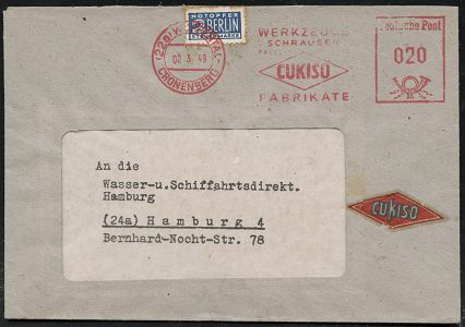 10275 | 18 € | 5600 WUPPERTAL (Absender-Freistempel) : (22a) WUPPERTAL-/ CRONENBERG/ WERKZEUGE/ SCHRAUBEN/ CUKISO/ FABRIKATE 1949 (2.3.) AFS Francotyp "Posthorn" 020 Pf. (Firmenlogo) auf 2 Pf. NoB (Zähnung stockig) + seltene Rhombus-Vignette: CUKISO (Abziehbild !) rs. Abs.-Vordruck, Fern-Bf. (Dü.E-20CGo) | ![]() ![]() | |
