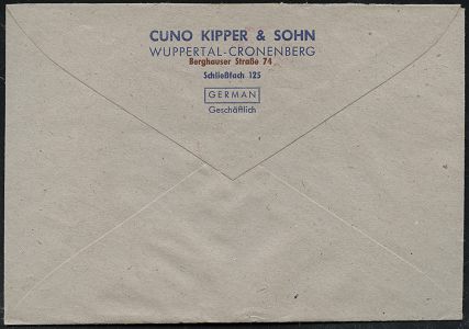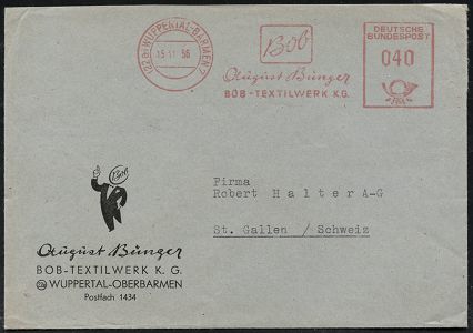 10290 | 16 € | 5600 WUPPERTAL (Absender-Freistempel) : (22a) WUPPERTAL-BARMEN 7/ Bob/ August Bünger/ BOB-TEXTILWERK AG 1956 (15.11.) AFS Francotyp 040 Pf. auf Ausl.-Firmen-Bf.: BOB-TEXTILWERK KG mit Herrenfigur (Dü.E-23CG) | ![]() | |