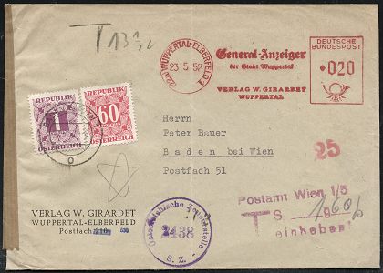 10283 | 30 € | 5600 WUPPERTAL (Absender-Freistempel) : (22a) WUPPERTAL-ELBERFELD 1/ General-Anzeiger/ der Stadt Wuppertal/ VERLAG W.GIRARDET.. 1952 (23.5.) AFS Francotyp 020 Pf. unterfrankiert auf Ausl.-Firmen-Bf.: VERLAG W. GIRARDET (Mittelfalte) + viol., sowjetischer Zensur-1K-HdN: Österr. Zensurstelle/2438/S. Z. = Wien (+ neutraler Streifen) + viol. HdN: Postamt Wien 1/5 Ts_____ g__/ eingeben + Portomarken 60 Gr. + 1 S., Nachgebühr-Zensur-Ausl.-Bf. (Dü.E-23DG + Mi.P 242, P 247) | ![]() | |