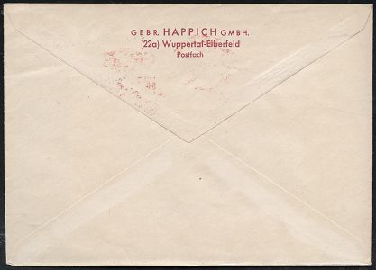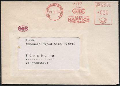 10288 | 18 € | 5600 WUPPERTAL (Absender-Freistempel) : (22a) WUPPERTAL-ELBERFELD 1/ G H E/ GEBR:/ HAPPICH/ GMBH 1955 (21.5.) AFS Francotyp = alte "D-Maschine" mit alter Zählnr.! (Monogr.-Logo) motivgl. Firmen-Bf., rs. Abs.-Vordruck (Dü.E-23DG h) | ![]() ![]() | |
