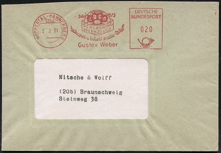 10293 | 18 € | 5600 WUPPERTAL (Absender-Freistempel) : (22a) WUPPERTAL-HAHNERBERG/ seit 1875/ SCHLAGRING/ WERKZEUGE../ Gustav Weber 1961 (2.2.) AFS Postalia (Firmenlogo: Schlagring vor Globus) Firmen-Fernbf., = sehr seltenes Motiv = Gangster-Waffe !! (Dü.E-23 B) | ![]() ![]() | |
