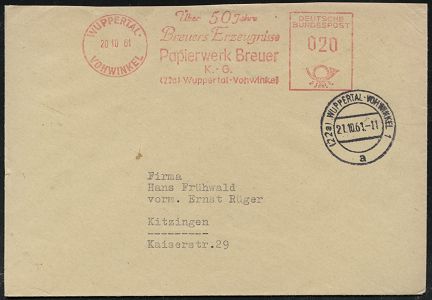 10295 | 16 € | 5600 WUPPERTAL (Absender-Freistempel) : WUPPERTAL-/ VOHWINKEL/ Über 50 Jahre/ Breuers Erzeugniss/ Papierwerk Breuer.. 1961 (20.10.) AFS Francotyp o h n e PLZ + 2K-Steg: (22 a) WUPPERTAL-VOHWINKEL 1/a = Datumskorrektur !, Fern-Bf. (Dü.E-23CG) | ![]() | |