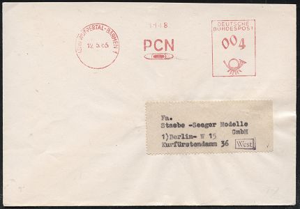 10298 | 18 € | 5600 WUPPERTAL (Absender-Freistempel) : (22a) WUPPERTAL-BARMEN 1/ P C N 1965 (12.5.) AFS Francotyp, alte "B-Maschine" mit alter Zählnr.u. alter PLZ, seit 1961 n e u e Postleitzahlen! (Firmen-Logo: Weberschiffchen) rs. Abs.-Vordruck mit alter PLGZ, Fern-Bf. n. West-Berlin (Dü.E-23BAh, Spätverwendung alte PLZ) | ![]() ![]() | |