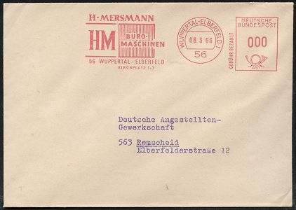 10301 | 14 € | 5600 WUPPERTAL (Absender-Freistempel) : 56 WUPPERTAL-ELBERFELD 1/ GEBÜHR BEZAHLT/ H.MERSMANN/ HM/ BÜRO-/ MASCHINEN.. 1966 (8.3.) AFS Francotyp in 000 + Gebühr bezahlt = Massen-Drs.! (vorschriftsmäßig vom 1.7.1954 - 30.9.1969) Fern-Bf. (Dü.E-26) | ![]() | |