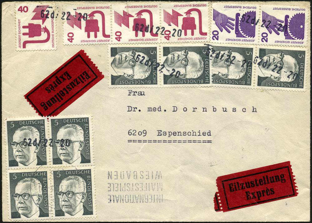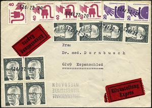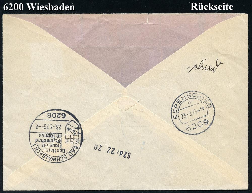 1278 | 28 € | 6200 Wiesbaden Allgem. Belege : 62 WIESBADEN 1/ INT./ MAIFESTSPIELE 1973 (22.3.) MWSt + 7x Datums-Eil-Zeilenstempel als nachträgl. Entwertung (Bf fehlt rs. Klappe) Fern- Eil-Bf. n. Espenschied, seltene Entwertung! (Mi.635 (8), 696 (2), 698 (4)) | ![]() ![]() | |