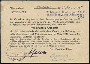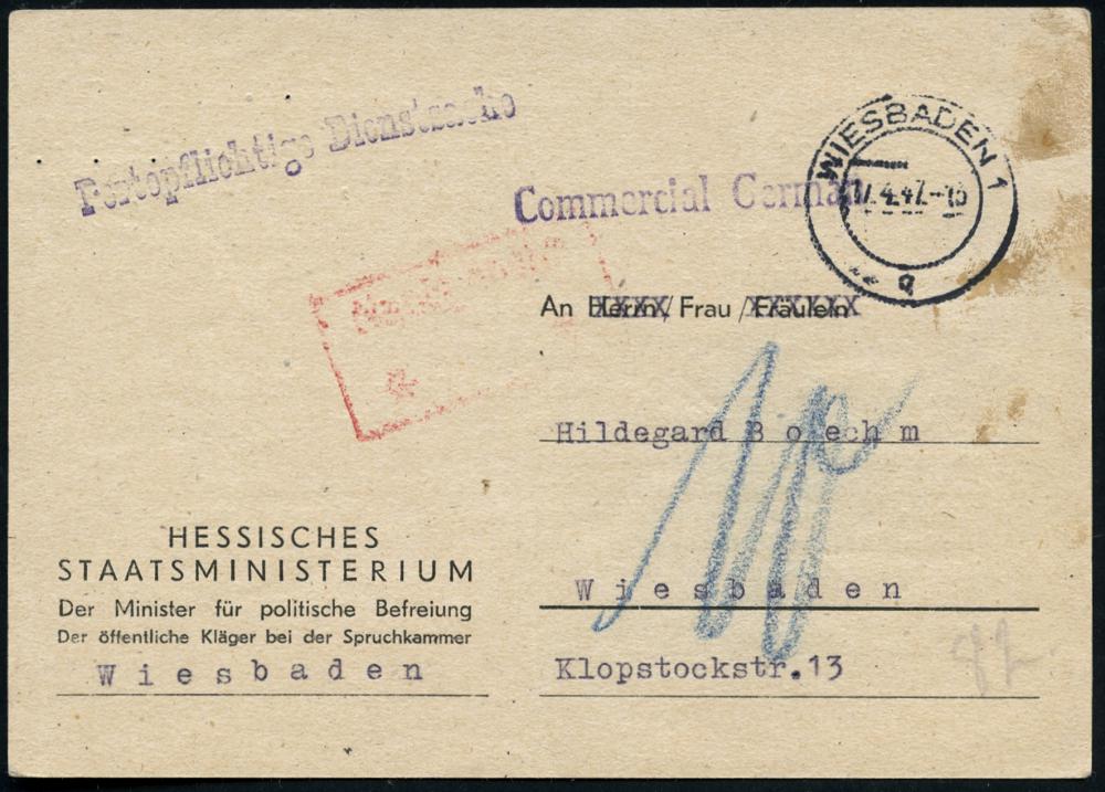 1268 | 30 € | 6200 Wiesbaden Allgem. Belege : WIESBADEN 1/ q 1947 (17.4.) 2K-Steg + viol. 1L: Portopflichtige Dienstdache auf Dienst-Kt.: ..Der Minister für politische Befreiung, Der öffentliche Kläger bei der Spruchkammer (2 Fleckchen, Nadelpunkte) + rs. Dienst-HdN, seltener Vordruck: Einstellung des Verfahrens auf Grund der Weihnachts-Amnestie, seltene Nachporto-Dienstkt. (= Wehrmachts-"Persil-Schein" !) | ![]() ![]() | |