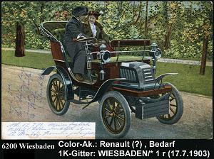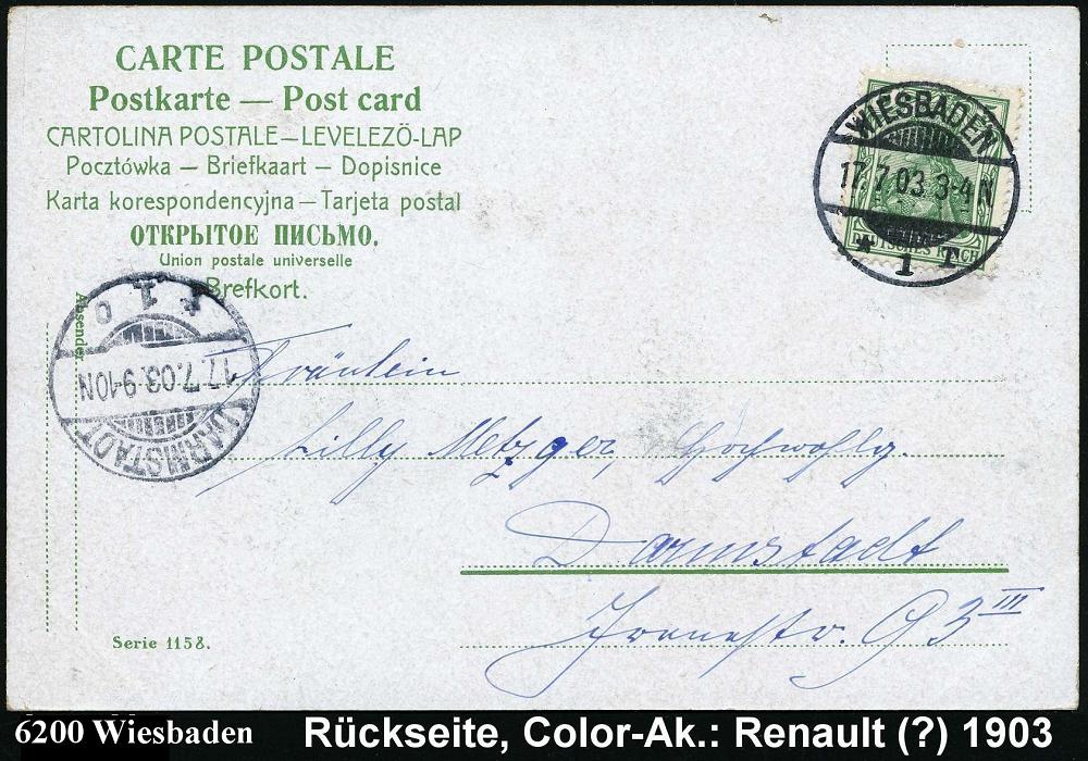 1253 | 14 € | 6200 Wiesbaden Allgem. Belege : WIESBADEN/ *1r 1903 (17.7.) 1K-Gitter auf Color-Foto-Ak.: Oldtimer (Renault ?) Bedarf | ![]() ![]() | |