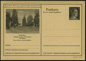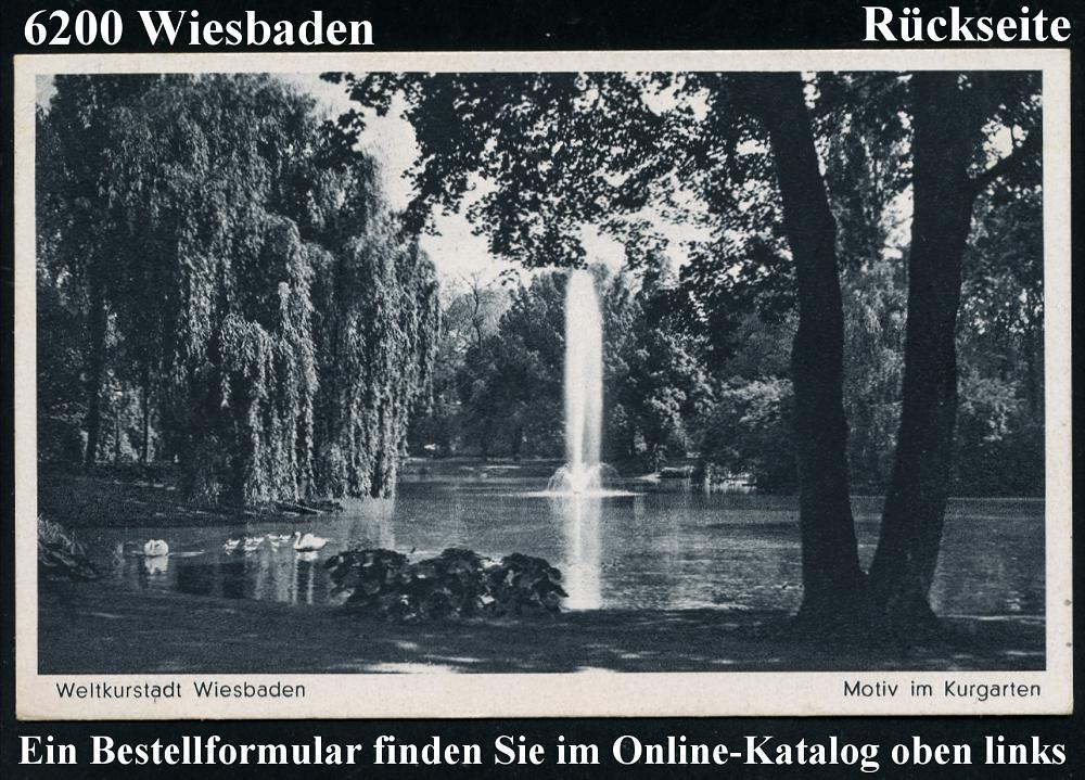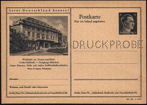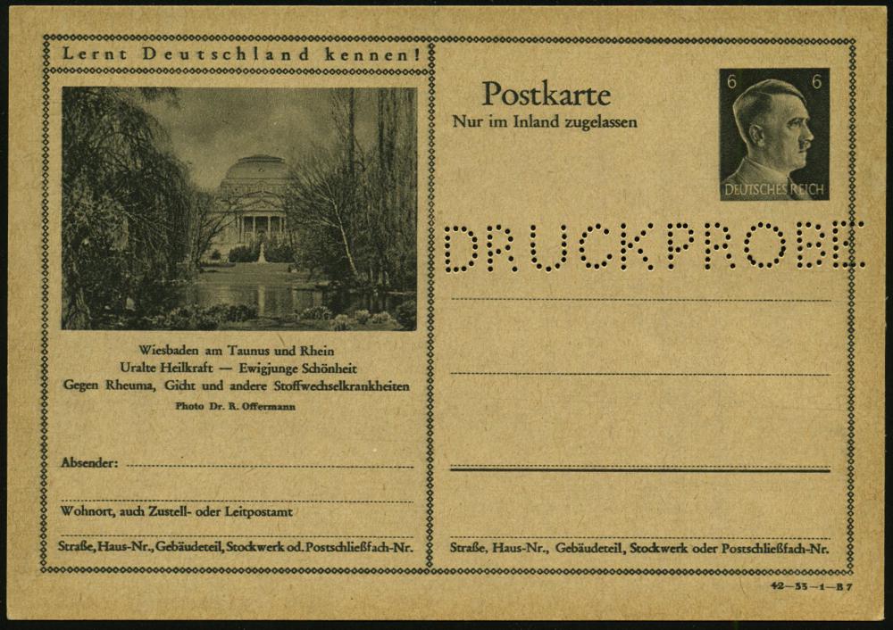 1263 | 25 € | 6200 Wiesbaden Allgem. Belege : Wiesbaden 1942 6 Pf. BiP Hitler, braun: ..Gegen Rheuma, Gicht u.a. Stoffwechselkrankheiten (Kurhaus, Kurpark) mit amtl. Lochung: DRUCKPROBE, ungebr., Aufl. nur 300 für UPU, Bern (Mi.P 307/42-35-B 7 = Specimen) | ![]() | |