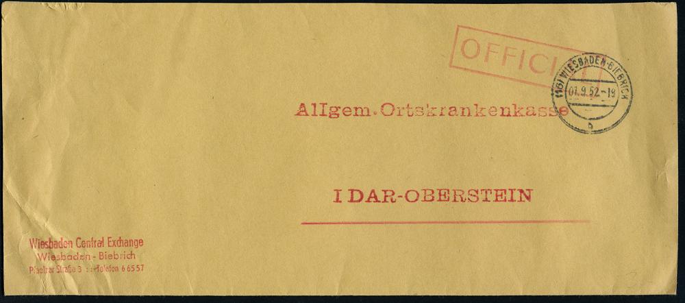 1270 | 14 € | 6200 Wiesbaden Allgem. Belege : (16) WIESBADEN-BIEBRICH/ b 1952 (1.9.) 2K-Steg + roter Ra.: OFFICIAL + roter Abs.-3L: Wiesbaden Control Exchange.. , portofreier Dienst-Bf. | ![]() | |